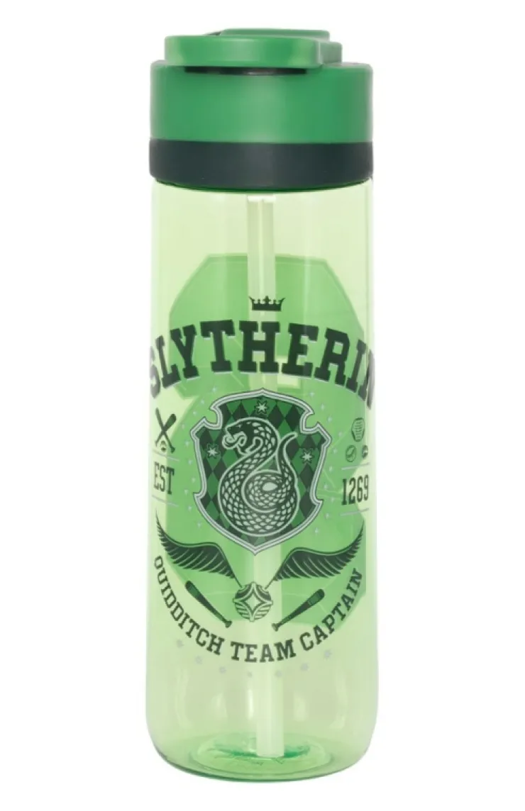 Slytherin Quidditch™ Team Captain travel bottle featuring the house colors and house icon as well as a button activated lid that pops out a straw.