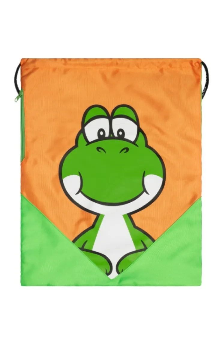 Yoshi green and orange drawstring bag from SUPER NINTENDO WORLD™.100% PolyesterScreen printedOne zippered side poc…