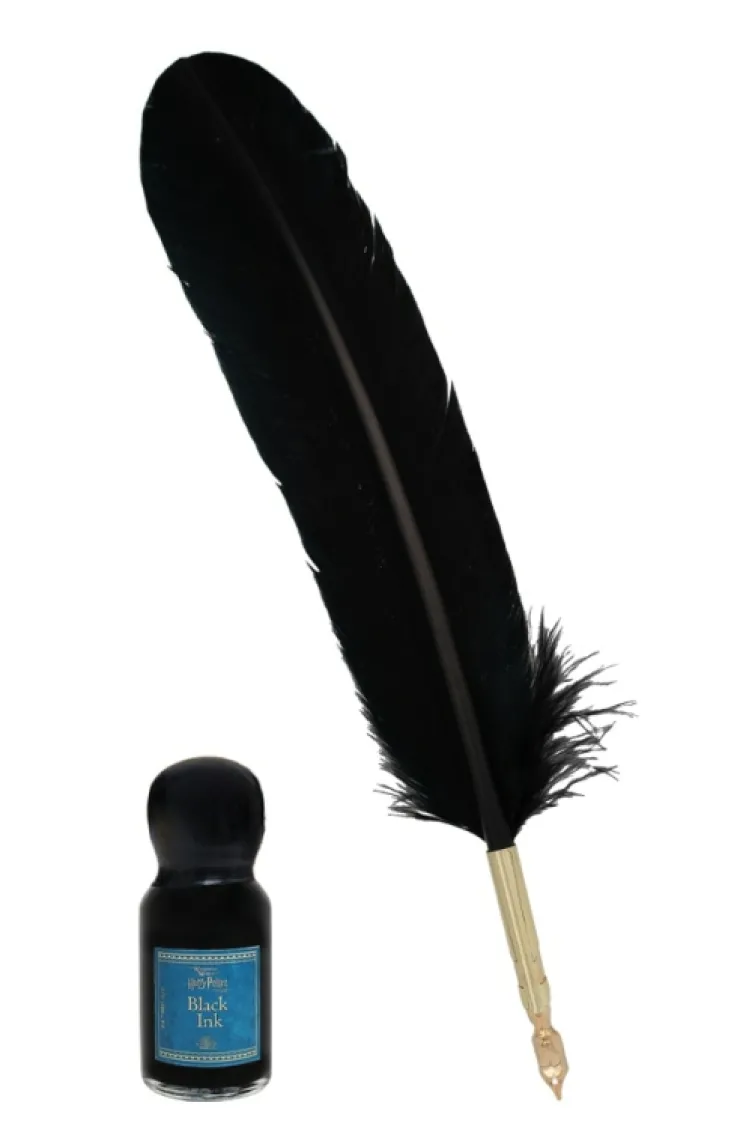 Begin your next writing adventure in style with this official The Wizarding World of Harry Potter quill pen and stand set. This set includes a black quill pen with bottled black ink and display box.