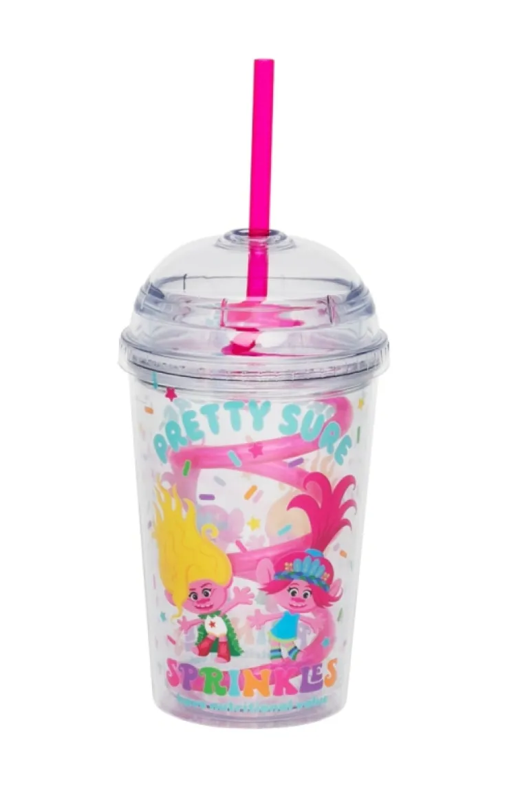 Trolls tumbler featuring some of your favorite characters in a cute cartoon design with "Pretty Sure Sprinkles" across the front. Tumbler includes dome screw-top lid and swirly straw.