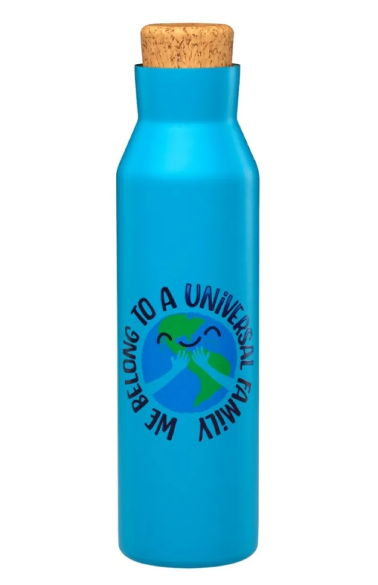 Our "We belong to a Universal Family" globe is proudly displayed on this take-anywhere-style, stainless steel travel bottle. This light blue bottle contains a twist-off cap to ensure your beverage stays secure during your travels.