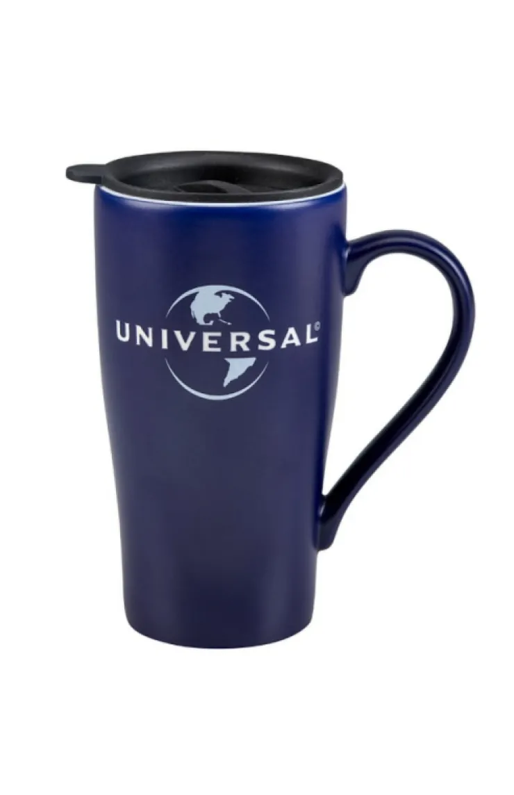 Travel mug featuring a Universal logo etched on matte blue ceramic has a spill resistant lid with a twist top, and is designed to fit nicely in your cup holder.