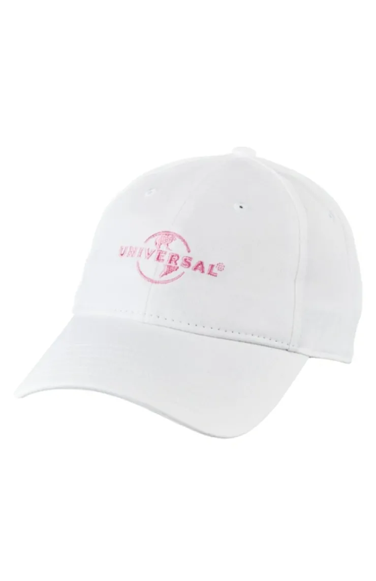 A wardrobe essential. This stylish white cap has a simple and sleek design that features an embroidered pink Universal logo on the front, adding a nice pop of contrast. The adjustable strap & buckle closure on back creates a comfortable fit.