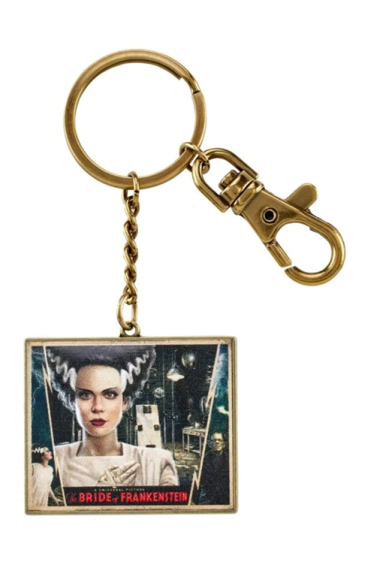 She's alive! ALIVE! Pay tribute to the classic Universal Monsters with this molded keychain featuring the iconic Bride of Frankenstein. Design is printed on antiqued gold-tone metal, with a lobster clap clip, and features artwork inspired by the 1935 film.