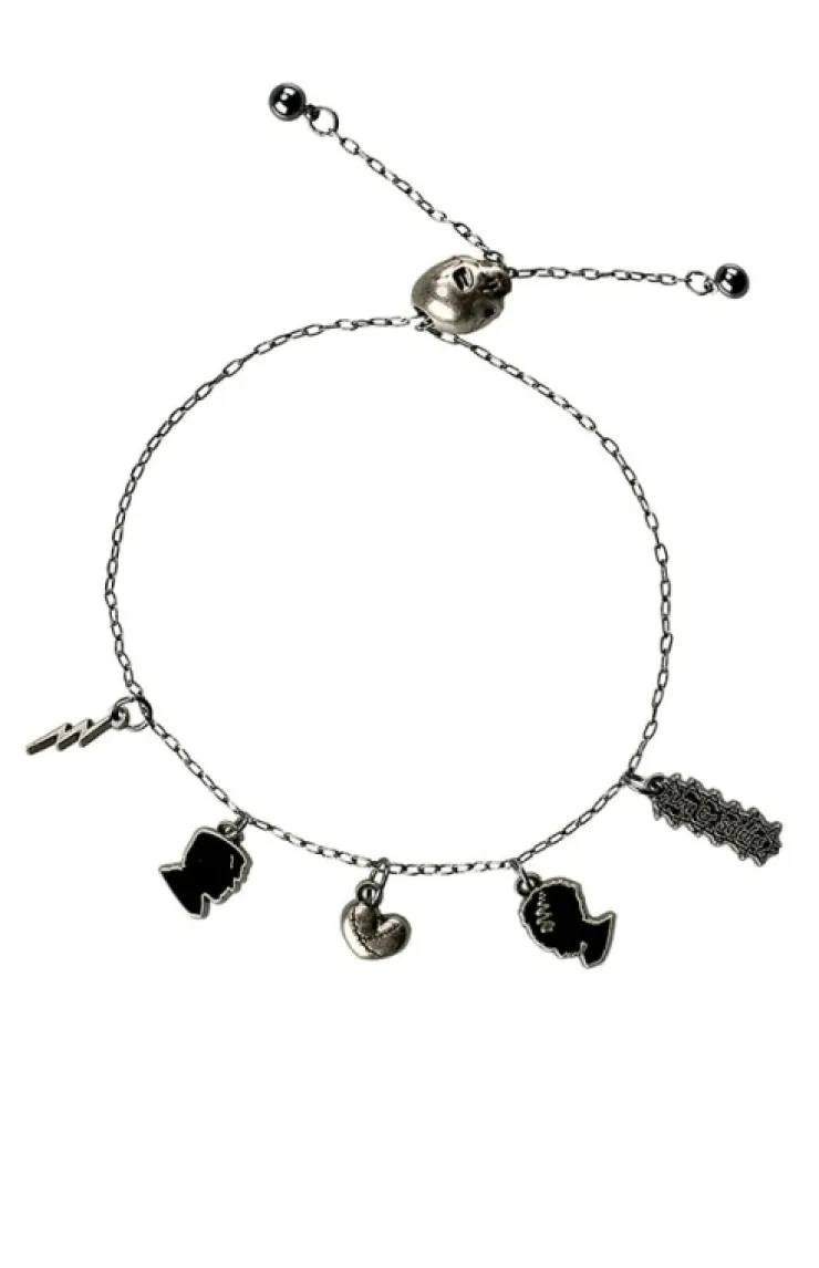 Pay tribute to horror cinema's most iconic power couple with this adjustable charm bracelet featuring Frankenstein's monster and his bride. Five intricately detailed charms including, a lightning bolt, Frankenstein's monster and his bride, a heart, and "Love & Stitches."