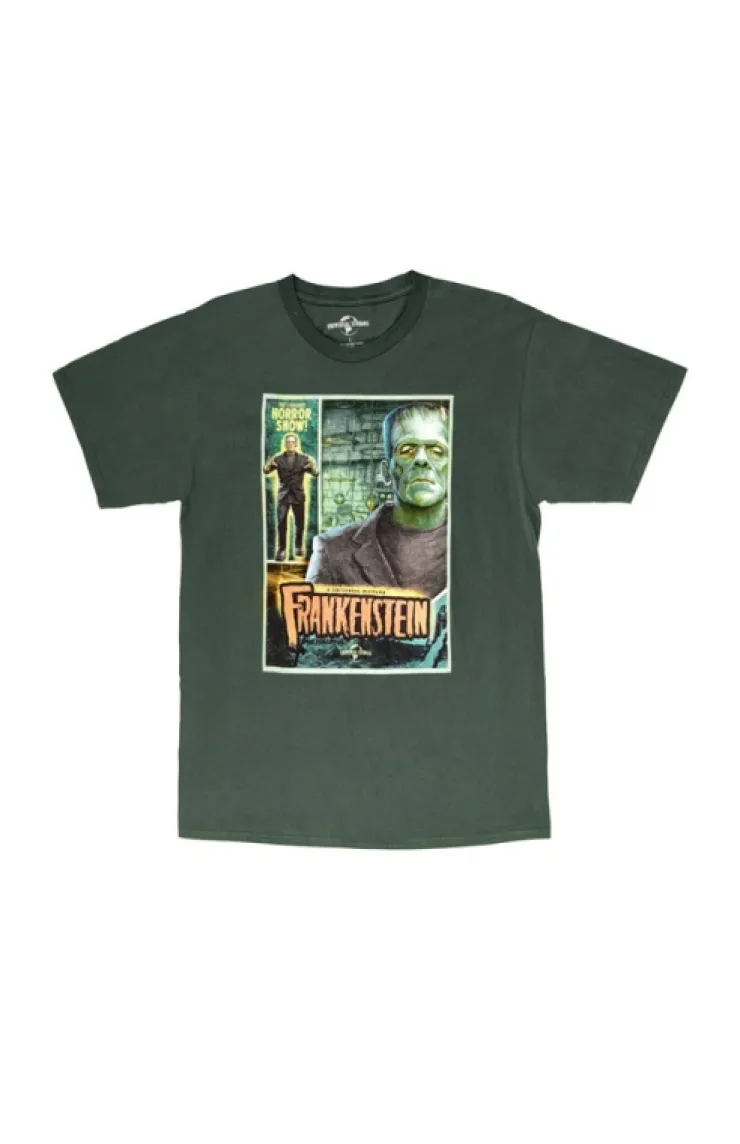 Look! It's moving! IT'S ALIVE! Pay tribute to the classics with this Universal Monsters adult t-shirt featuring the iconic Frankenstein's monster. Design is screen printed on a soft, light weight, olive green garment that contains artwork inspired by the 1931 film.