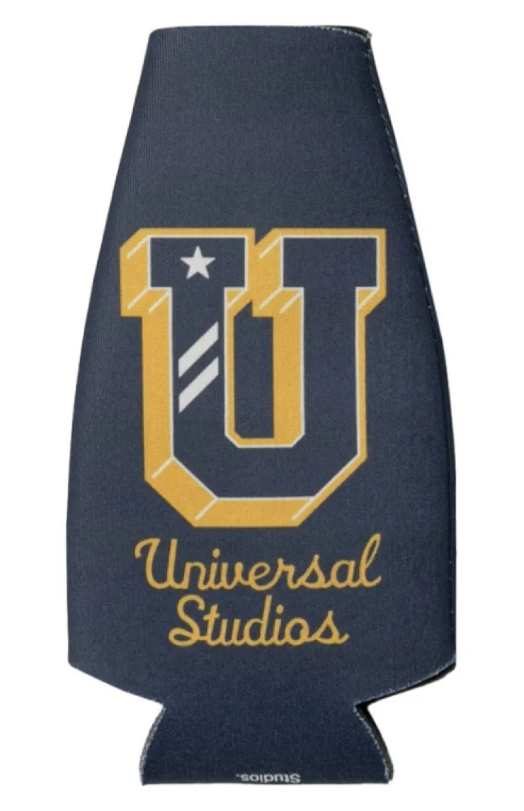Show your collegiate spirit and keep your bottle cool with this Universal Studios 1912 bottle cooler. The design features a navy blue shell with yellow words and a zipper on the back to easily close the top around your bottle.
