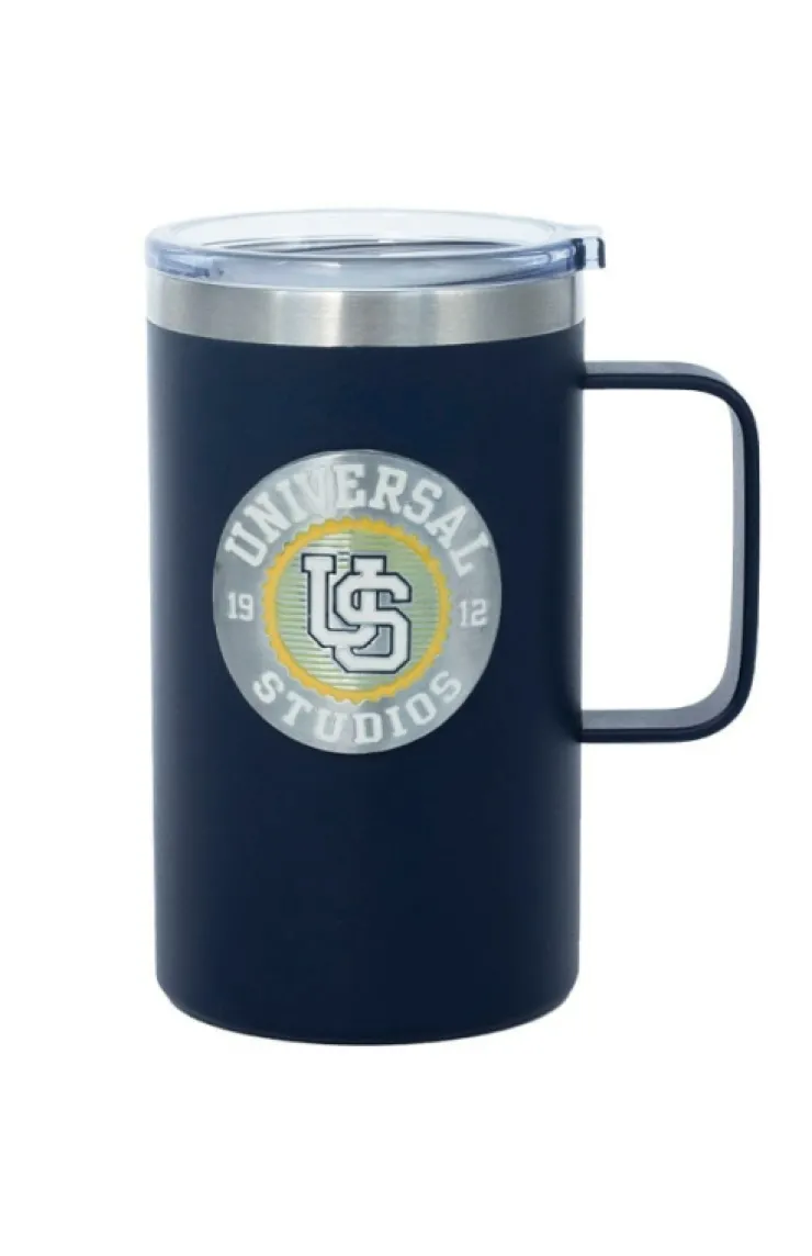 Show your collegiate spirit with this Universal Studios 1912 logo travel mug. Design features a navy blue matte finish with a spill resistant lid.