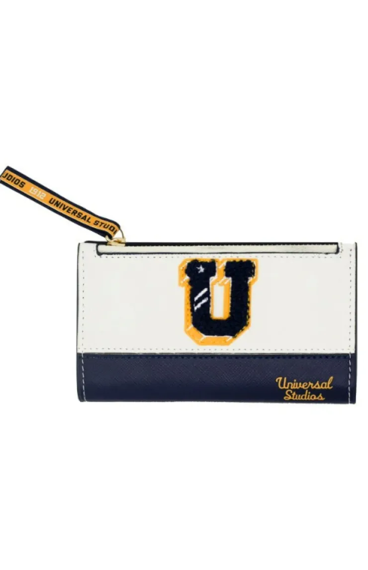 Show your collegiate spirit with this Universal Studios 1912 this fold wallet. The wallet features a button clip closure, credential pocket with transparent window, five card sized pockets, two interior pockets and one zipper pocket on the top.