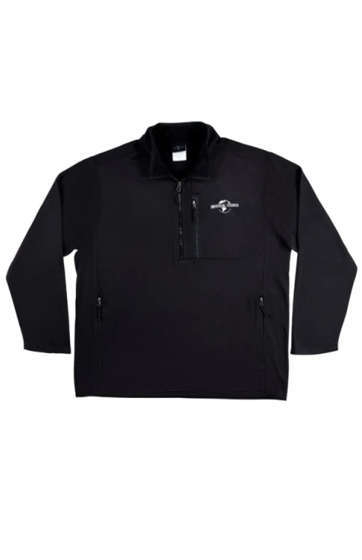Simplistic pullover sweater with quarter zip closure and three separate zippered pockets. Solid black sweatshirt is accented by the white embroidered "Universal Studios" globe.