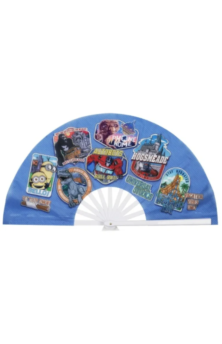 Universal Studios hand fan with a fun multi-character collage design featuring various characters from through-out the Universal theme parks.