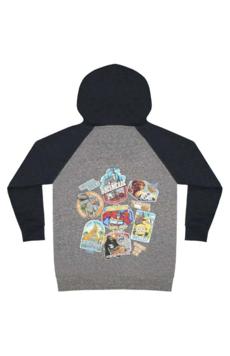 Universal Studios gray and navy blue zippered hooded sweatshirt with "Universal Studios" on the front left side and a fun multi-character collage design featuring various characters from throughout the Universal theme parks on the back.