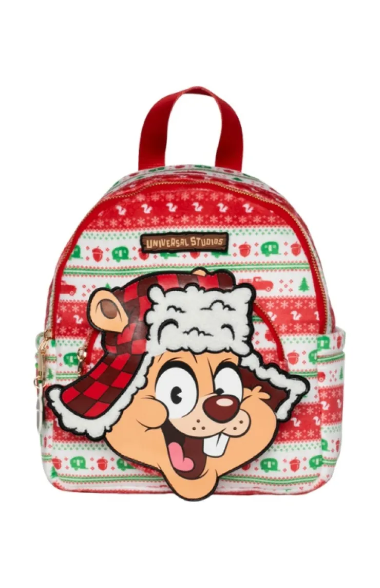 Universal Studios mini backpack featuring Earl the Squirrel on a festive fair isle pattern.