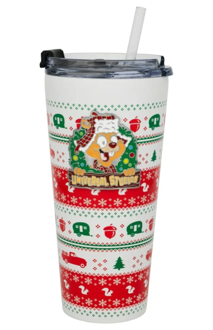 Universal Studios stainless steel tumbler featuring Earl the Squirrel on a festive fair isle pattern. Designed for both …