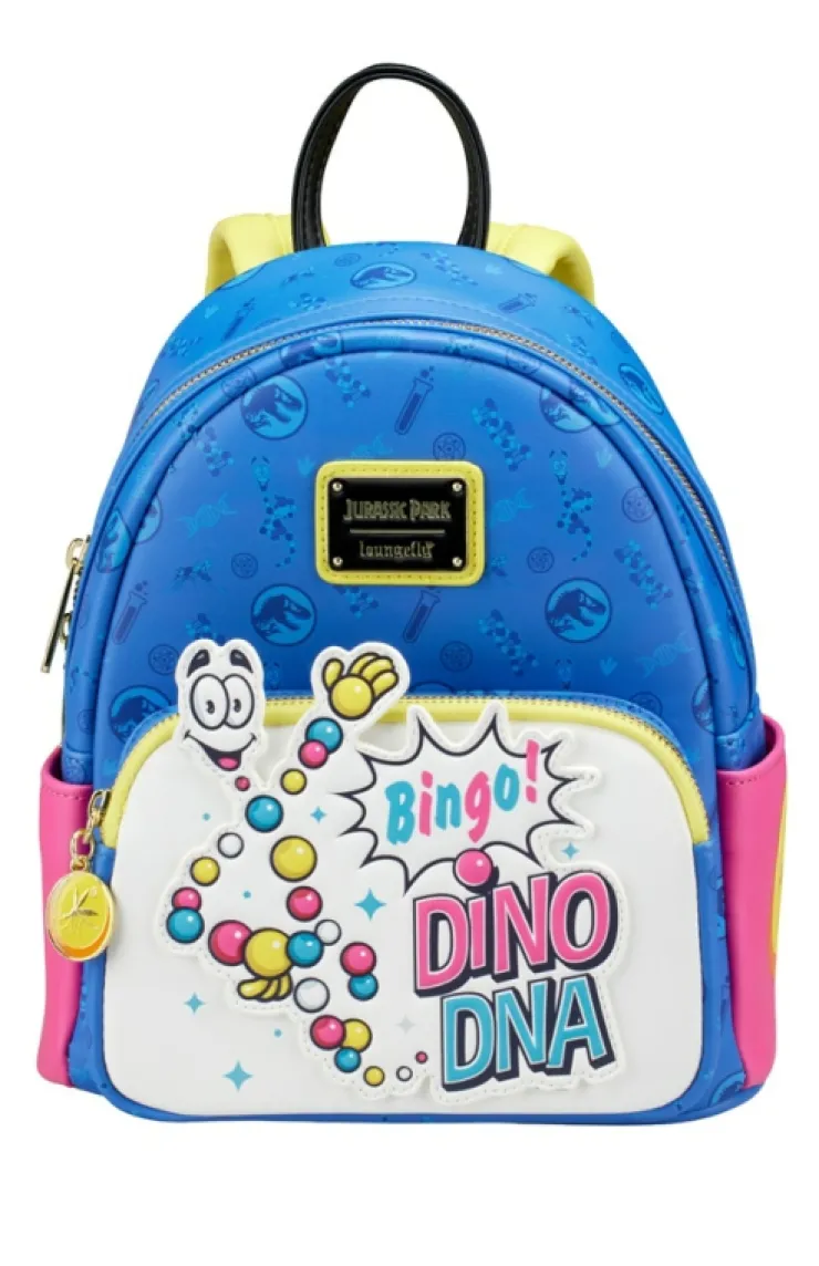 Bingo! A Mr. DNA mini backpack from Loungefly! The front of the back features vibrant colors as well as Mr. DNA and his iconic line "Bingo! Dino DNA!" while back features a DNA twist on the iconic Jurassic Park logo. With one main zippered compartment you can separate your amber and keep them safe. The interior zippered compartment will protect your Dino DNA while the exterior can store your Jurassic Park essentials. The adjustable shoulder straps makes it so your bag is secure while you tour Isla Nublar. Bag also contains a classic amber and mosquito charm. This item is a Universal Studios exclusive!