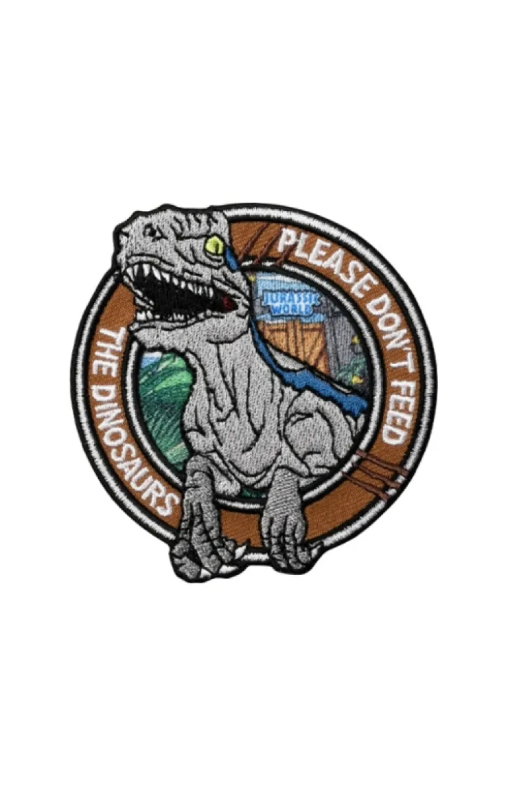 Universal Studios embroidered patch featuring a fun and colorful Jurassic World design with "Please don’t feed the dinosuarsl" across the front.
