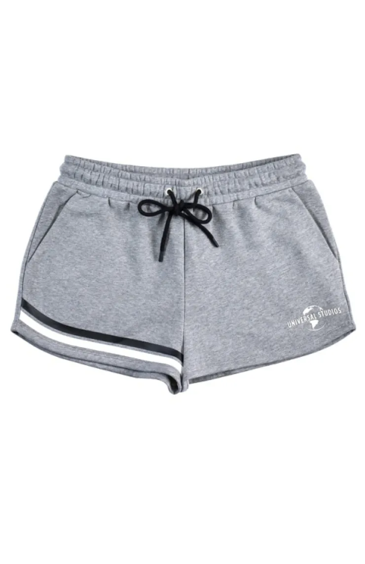 Cute and comfortable drawstring lounge shorts featuring the "Universal Studios" globe logo on the left leg. The grey fabric is accented with the black adjustable drawstrings at the waist.