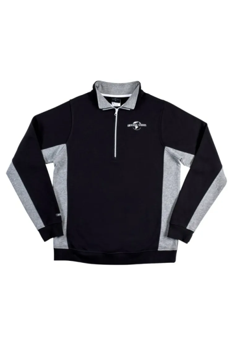 Sleek and comfortable pull over sweatshirt with quarter-zip up features. The black sweatshirt has gray accents and an embroidered "Universal Studios" globe.