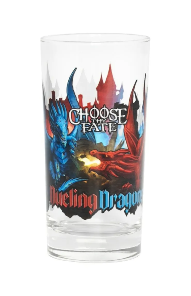 Show your love for the historic and iconic Dueling Dragons rollercoaster with this collectible glass showcasing the Fire & Ice dragons in the middle of a ferocious battle. The glass features "Choose Thy Fate, Dueling Dragons" across the front. What will your fate be?