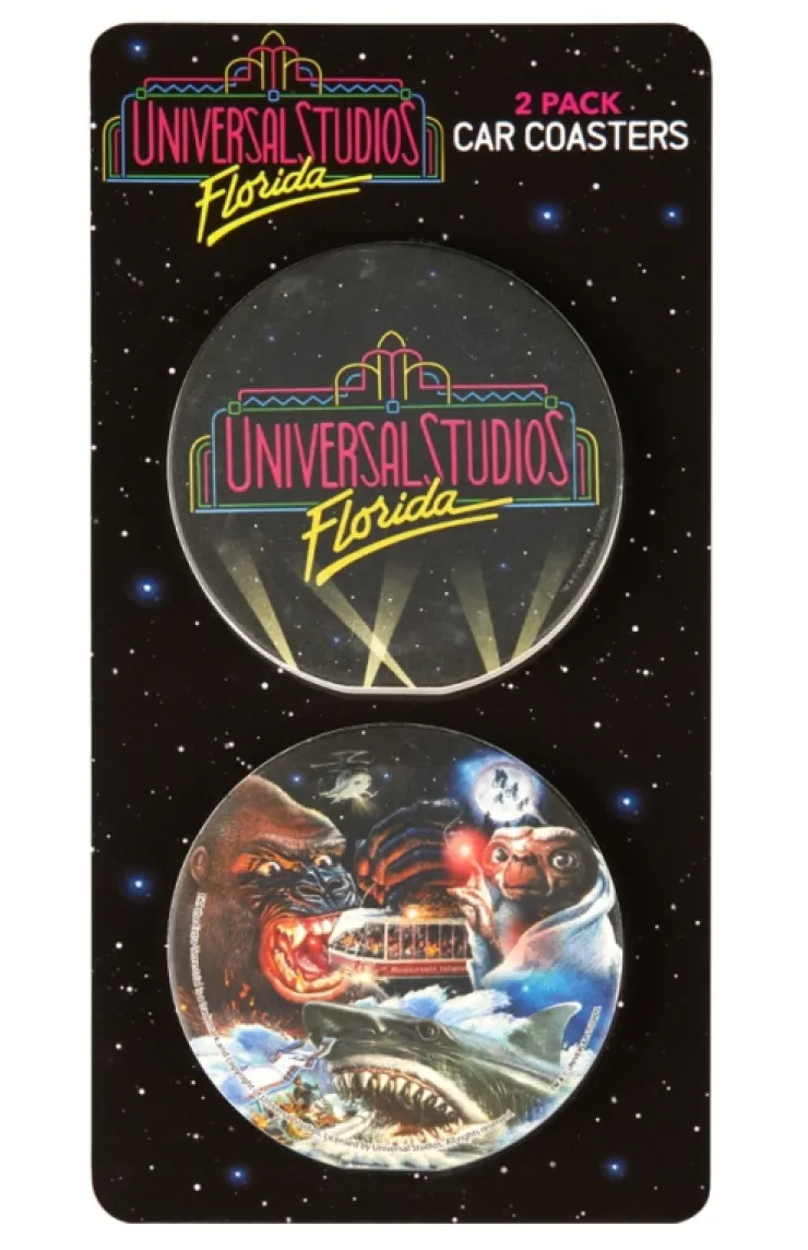 Relive your first trip to Universal Studios as we throw back to our roots, commemorating the classics with this collectible Universal Studios Florida car coaster 2-pack. Design features our retro marquee logo on one, and illustrations that pay homage to some of the iconic classics that started it all – E.T., King Kong, and Jaws on the other. Car coasters help absorb condensation and spills to keep your cup holder clean.
