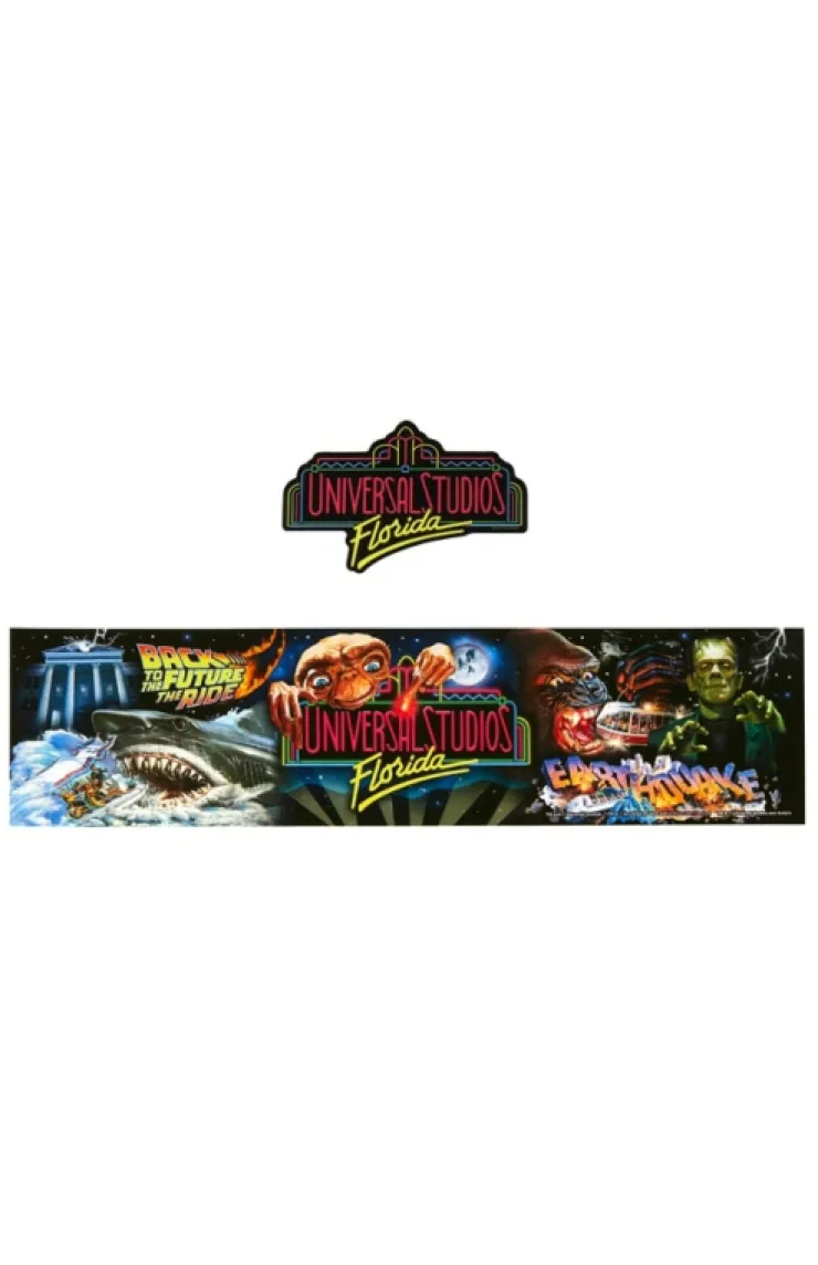 Relive your first trip to Universal Studios as we throw back to our roots, commemorating the classics with this collectible Universal Studios Florida decal & bumper strip 2-piece set. Decal design features our retro marquee logo, and the bumper strip features illustrations that pay homage to some of the iconic classics that started it all – E.T., Back To The Future, King Kong, Jaws, Earthquake, and Frankenstein.