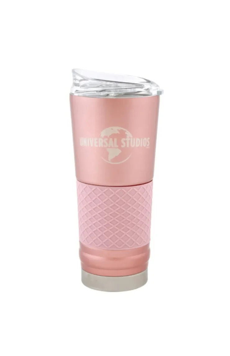 Take your drink on the go with this elegant Universal Studios etched, rose gold-tone travel tumbler. It’s vacuum insulated to keep your drink at just the right temperature, features an ergonomic rubber grip, and has a clear, tight-fitting lid with an open/close slider to help reduce the chance of spills.