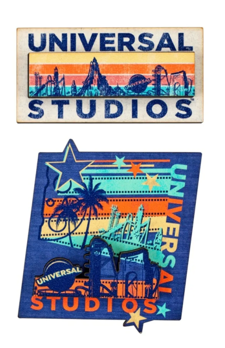 Set of two Universal Studios wooden magnets. One magnet features the iconic Universal Orlando Skyline, and the other contains both Islands of Adventures skyline, and the Universal Studios Florida skyline raised off of a navy background with multiple contrasting colors.