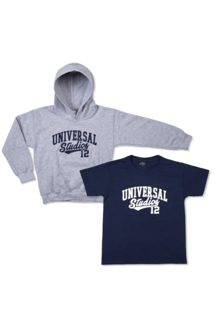 Combine style with value in this navy and gray youth t-shirt and fleece combo, each with the Universal Studios logo in reversed colors.
