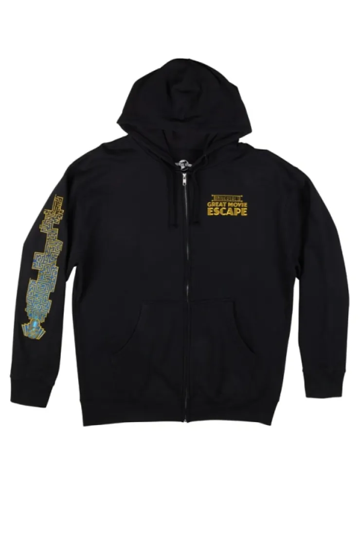 No better way to experience "Universal's Great Movie Escape", than nice and warm with this adult hooded zip-up sweatshirt. The back design features images from the two iconic films the escape rooms are themed after, Jurassic World, and Back to the Future. While a blue and gold maze runs vertically on the right sleeve.