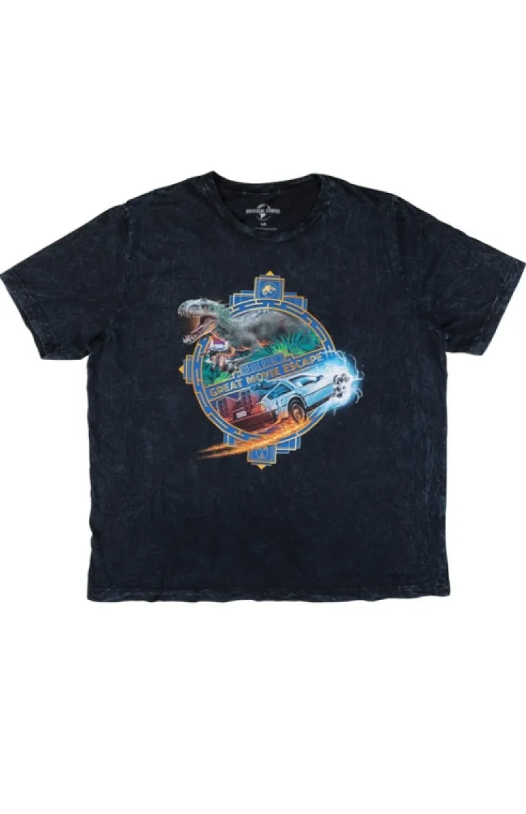 Distressed two-tone t-shirt featuring Universal Studio's latest adventure, "Universal's Great Movie Escape". Screen printed design features images from the two iconic films the escape rooms are themed after, Jurassic World, and Back to the Future.