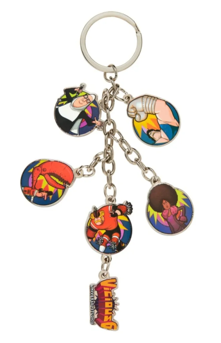 Show your love for the Vicious 6 with this keychain containing six different charms on dangle link chain. Charms include some of the most evil villains around including Strong Hold, Nun-Chuck, Svengeance, Jean-Clawed, Belle Bottom and the iconic Vicious 6 logo.