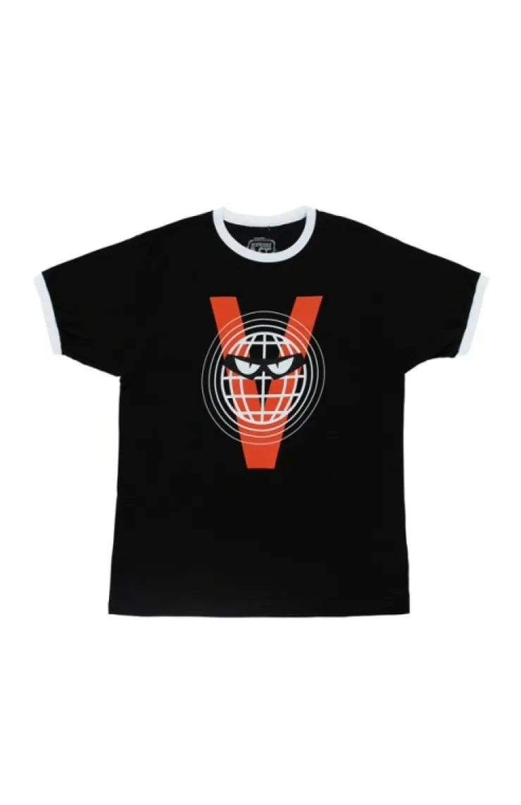 Gear up for convention season with this adult ringer t-shirt featuring the infamous Villain-Con logo. Graphic is screen printed on comfortable, solid-black garment with white trim accents around the neckline and sleeves.