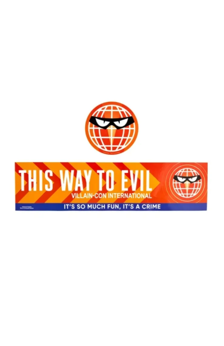 Let everyone know you are heading to Villain-Con with this auto decal & bumper strip set. Set includes the infamous Villain-Con logo decal, and bumper sticker that reads "This Way to Evil".