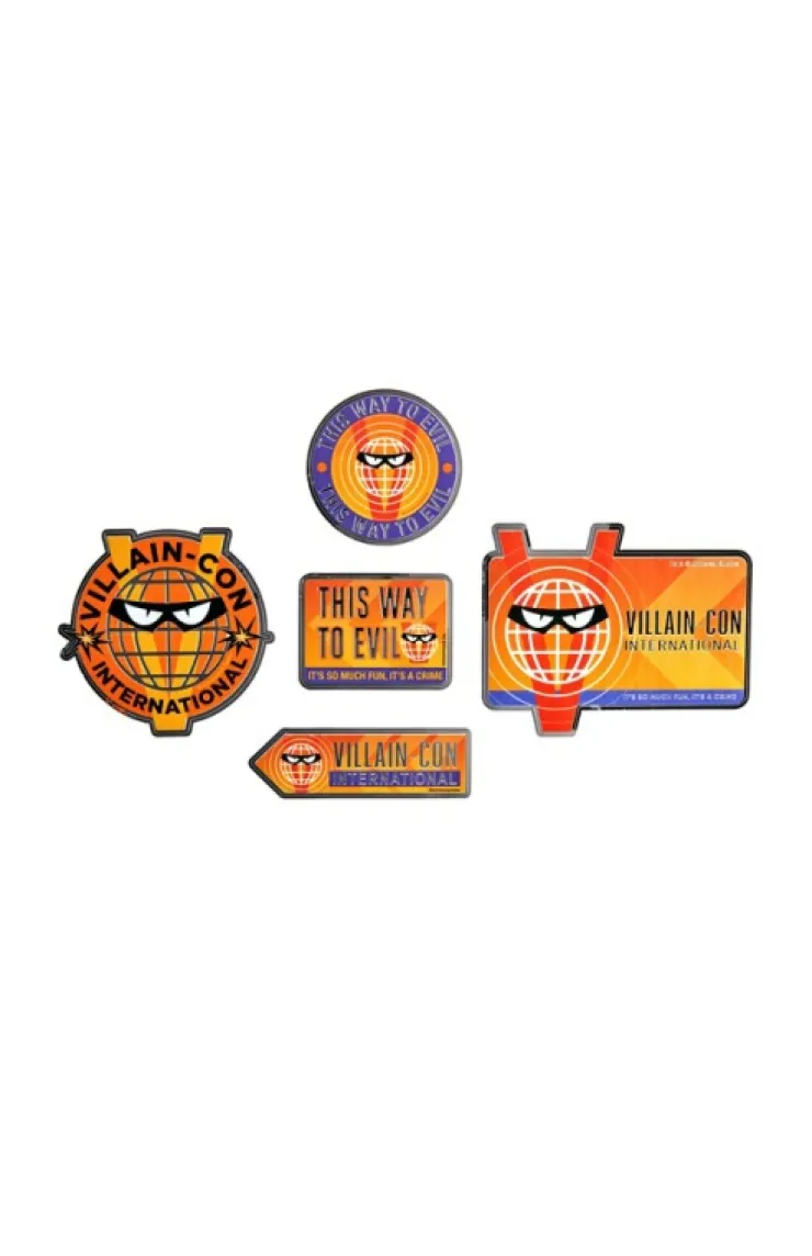 Commemorate your love for the infamous Villain-Con with this chrome sticker set featuring five different designs.