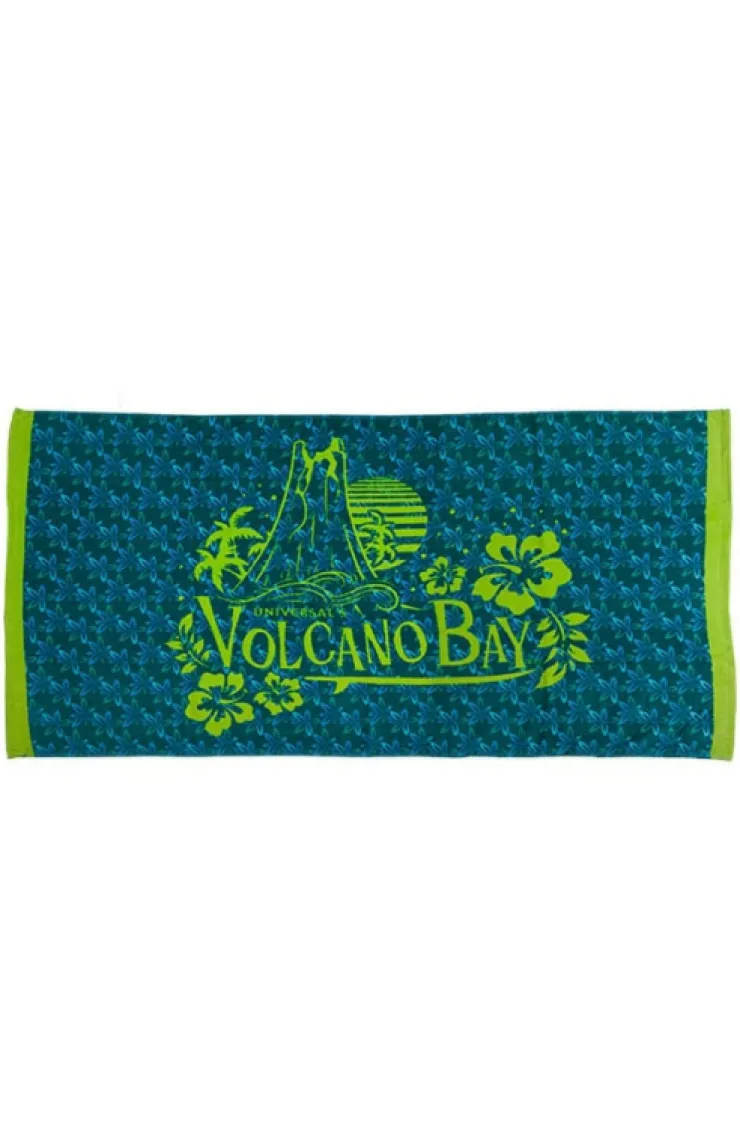Mark your beach oasis with a towel in island flower pattern of spring green and lagoon blues with Volcano Bay logo on top.