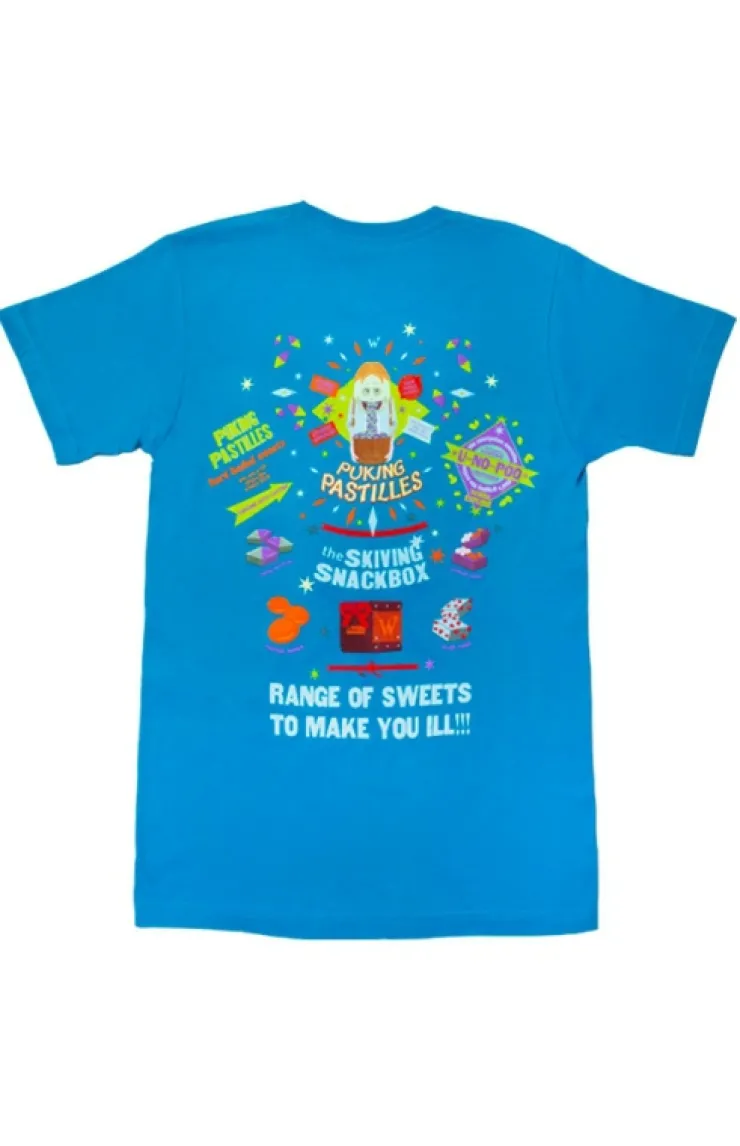 Weasleys' Wizard Wheezes adult t-shirt with "Range of sweets to make you ill!!!" design. Featured sweets included U-No-Poo Chocolate, Nosebleed Nougat, Fever Fudge, Fainting Fancies, and the iconic Puking Pastilles.