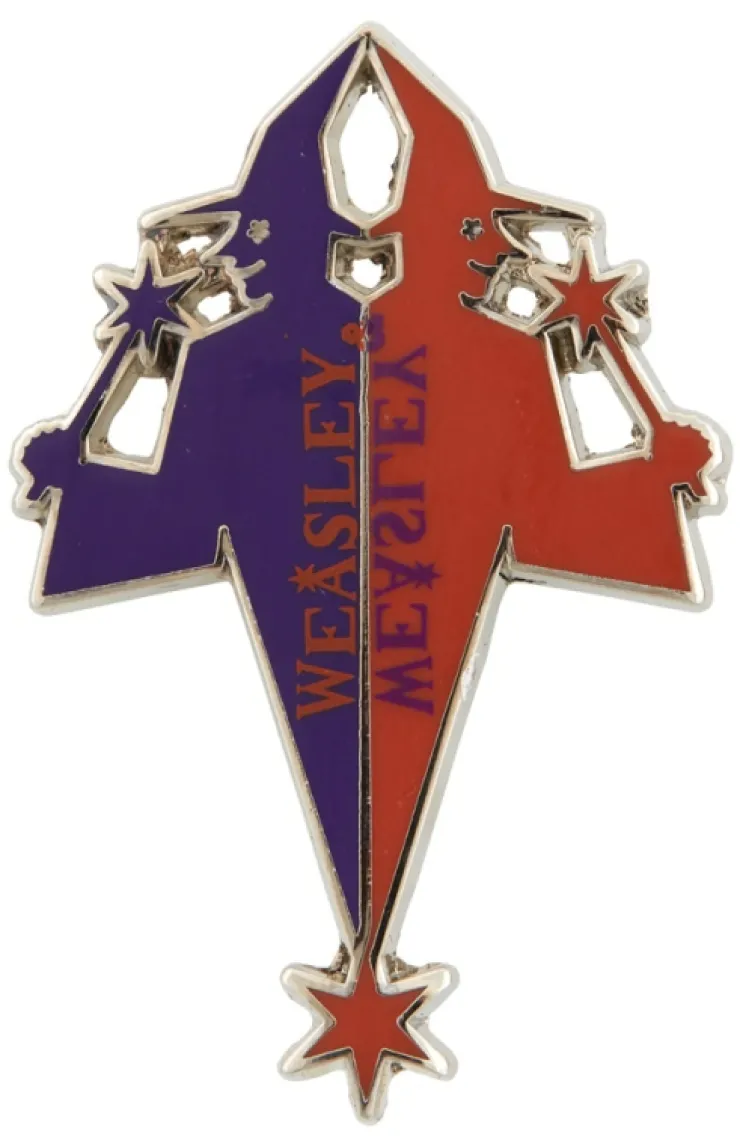 Colorful pin featuring the Weasleys’ Wizard Wheezes logo, enamel filled over silver-tone metal.