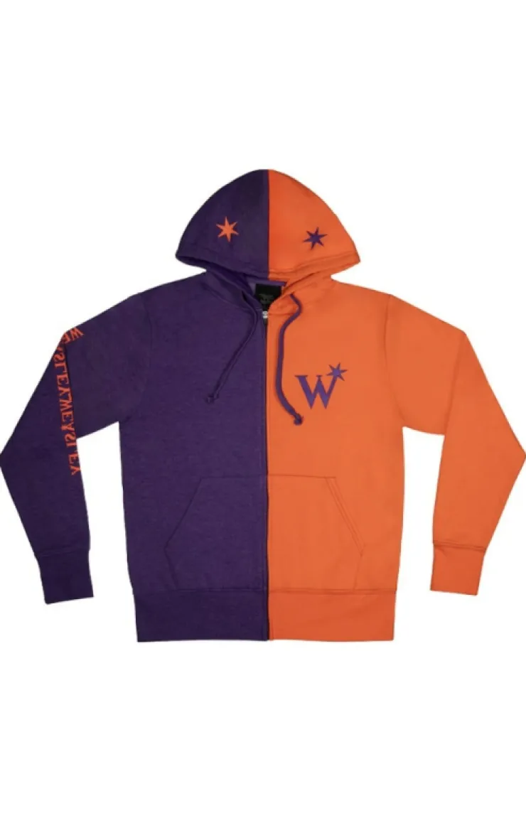 Purple & orange zippered hooded sweatshirt featuring the Weasleys' Wizard Wheezes logo.