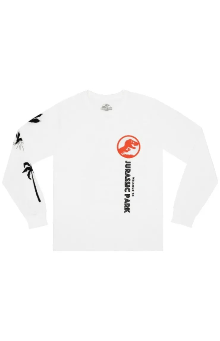 Jurassic Park white long-sleeve adult t-shirt featuring "Welcome to Jurassic Park" with red dinosaur accents on the front and back, with iconic symbols down the right sleeve.