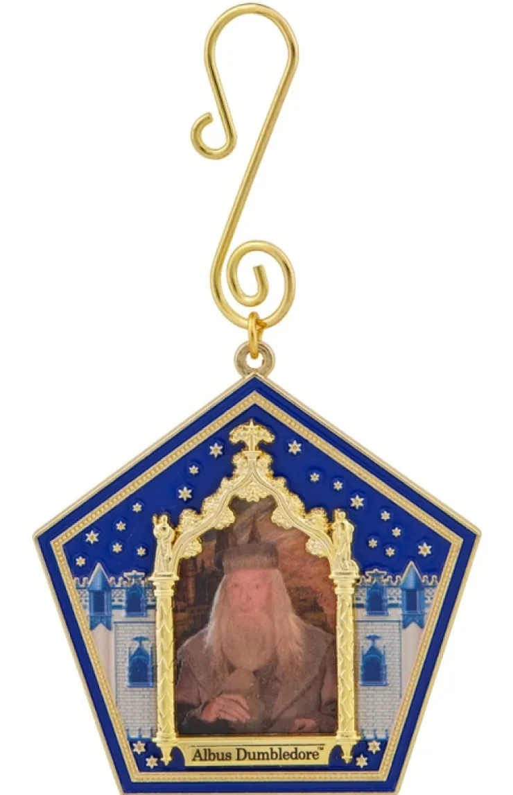This unique Chocolate Frog™ wizard card ornament features a holographic portrait of Albus Dumbledore™, and comes accented by a gold-tone spiral ornament hook.