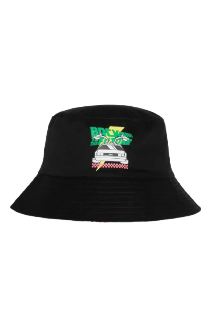 Back to the Future reversible bucket hat in the color black featuring the time machine in front of a lightening bolt with the Back to the Future logo across the top. Reverse side features the Back to the Future logo and lightning bolts on a colorful retro checkered background.