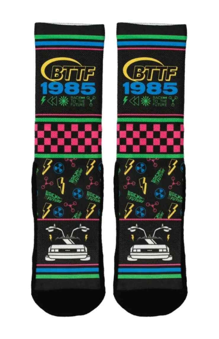 Back to the Future socks in the color black featuring the time machine with colorful symbols from the film and "BTTF 1985" across the top.
