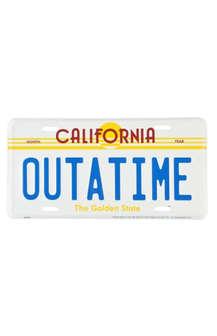 Deck out your Time Machine with this fun, replica Back To The Future metal license plate featuring "OUTATIME" on a California state plate.