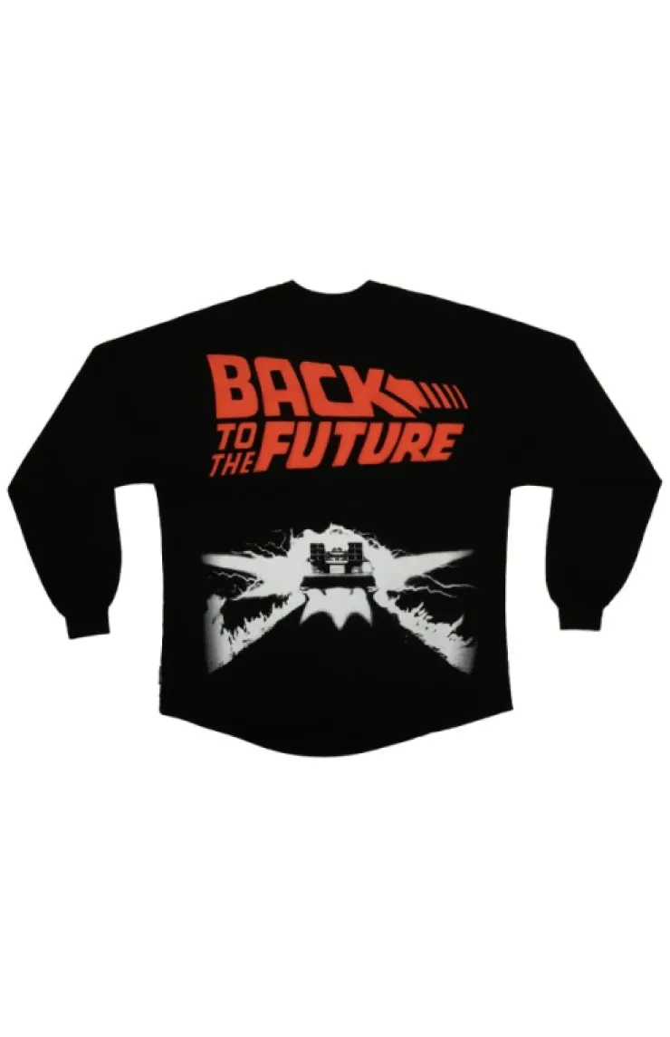 Back to the Future Spirit Jersey in the color black featuring the Back to the Future logo on front left side. On the back features the time machine with "Back to the Future" across the top.