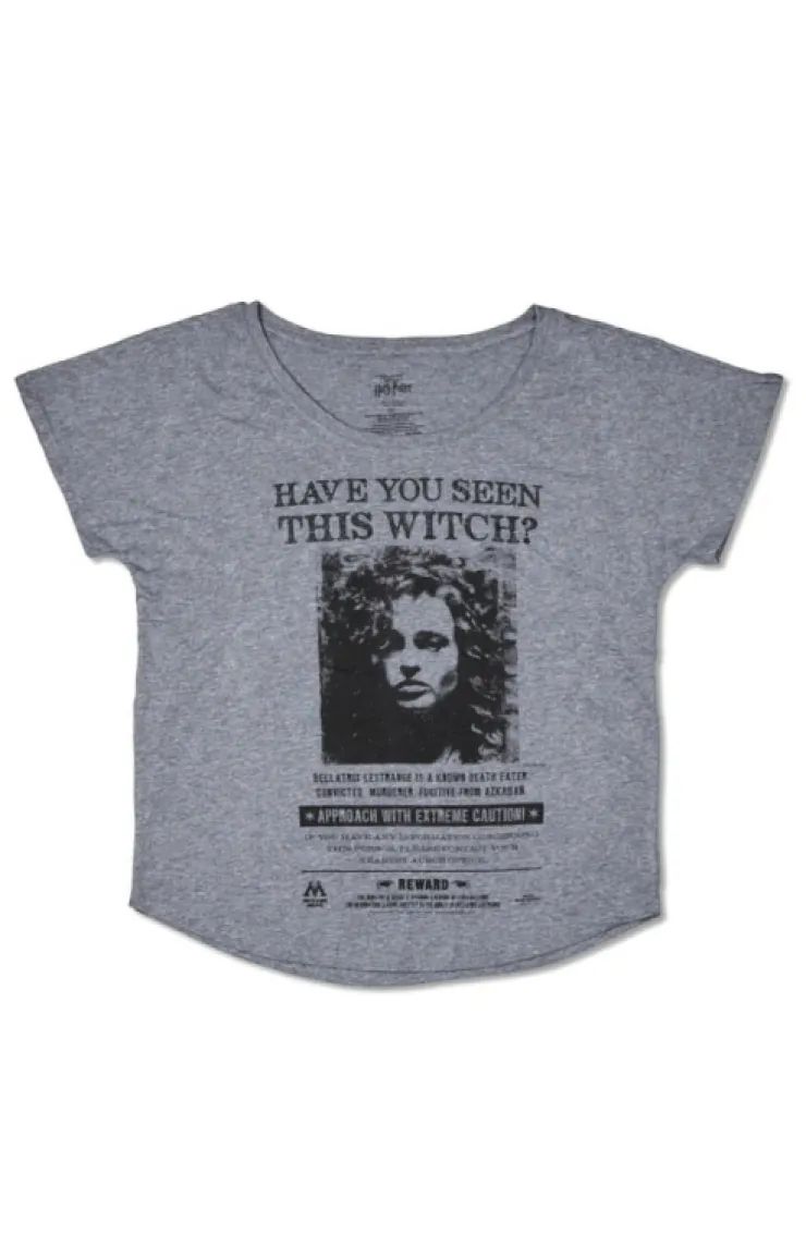 Have you seen this witch? This stylish shirt features Bellatrix Lestrange’s wanted poster with a glittering headline from The Wizarding World of Harry Potter™. Design is screen printed on soft, lightweight shirt body with dolman sleeves, a scooped neckline, and rounded hem.