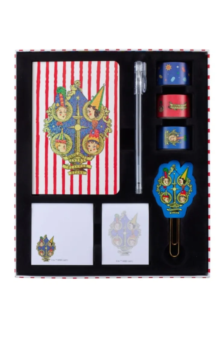 This Bertie Bott's Every-Flavour Beans themed stationery set comes with one lined notebook, one pen, one paper clip, two different sets of sticky notes, and three different rolls of washi tape.
