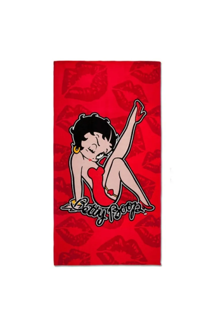 Kick it up on the beach with Betty Boop on the hottest towel for fun in the sun. Curvy, seated Betty kicks up her leg with a saucy wink from a backdrop of lipstick kisses on her signature red. Towel is soft 100% cotton.