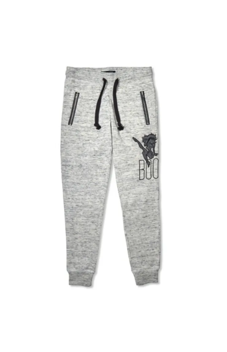 Comfy and stylish is what you’ll be in these soft, cream colored lounge pants featuring a curvaceous Betty Boop silhouette, detailed in black faux leather with "Boop" embroidered on heathered fabric. Trendy loungewear has 2 zippered front pockets with faux leather trim, drawstring waistband, and ribbed pant cuffs for a snug fit.