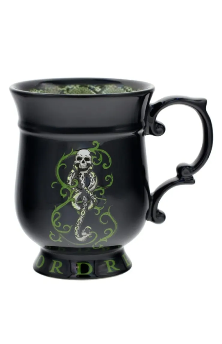 Black ceramic mug featuring the Dark Mark and the spell "Morsmordre" on the bottom. The interior of the mug has a green and black snake scale pattern as well. When a hot beverage is added to the mug, the spell will appear on the opposite side of the Dark Mark. Mug has decal designs that must be hand washed to ensure they stay intact.