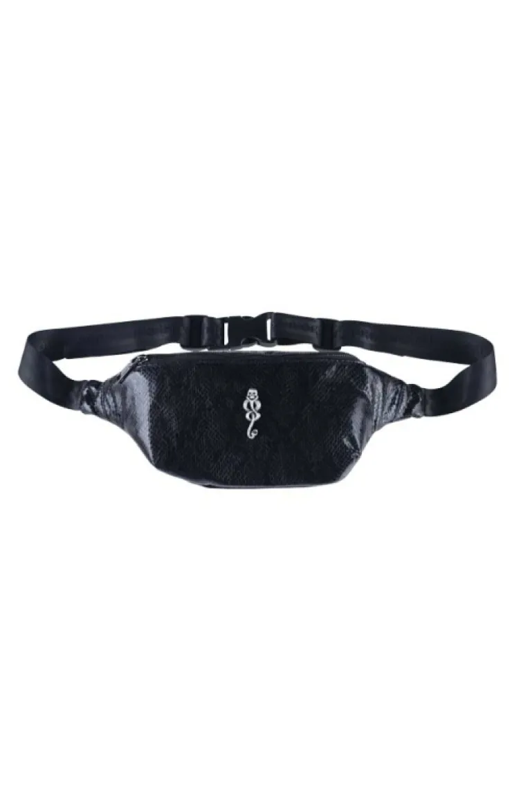 Sleek waist bag featuring a metal accent of the Dark Mark on the front and its incantation "Morsmordre" patterned subtly across an adjustable belt strap with clasp. Faux snakeskin leather design has a zippered main compartment and an interior pocket with zipper.